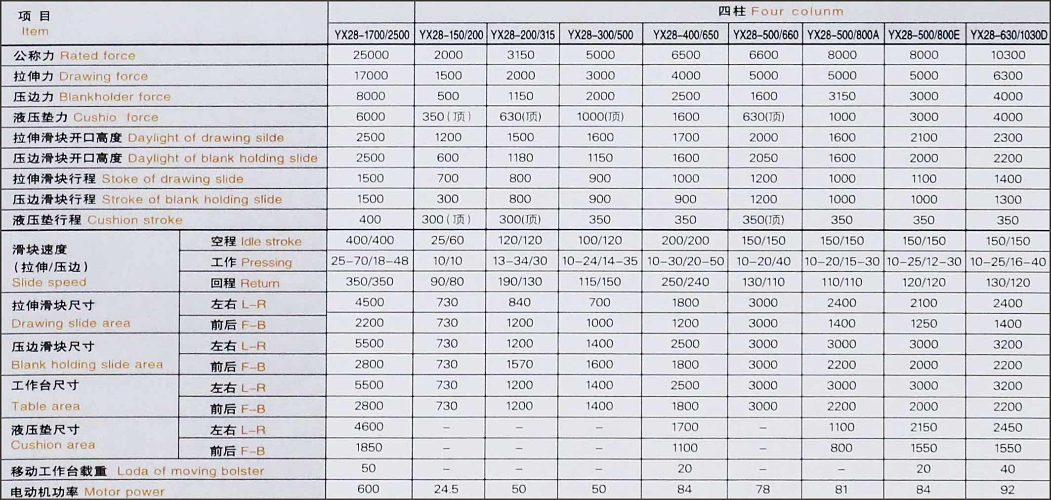 移動工作臺沖裁緩沖裝置壓邊滑塊,液壓墊死角分別調壓裝置(拉伸不對稱零件)光電保護裝置換模用浮動導軌和滾動托架